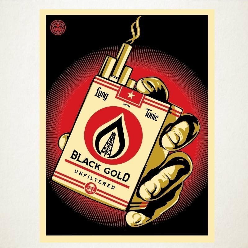 El adhesivo de vinilo es una replica de un cartel donde se ironiza sobre el mismo oro negro que también esta presente en el tabaco.